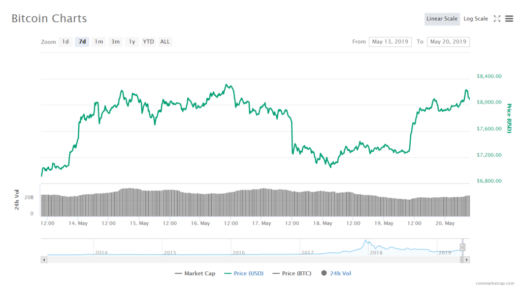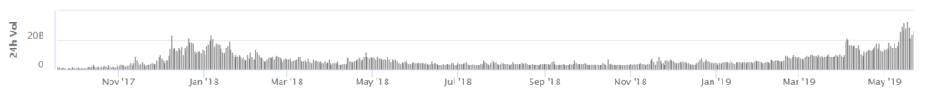 2017년 12월 17일, 비트코인은 $20,000를 찍은 후 큰 조정장에 들어갔다. 그리고 2019년 3월이후 거래량이 증가하기 시작하면서 5월 14일이후로 급등하면서 다시금 비트코인의 가치가 조명되고 있다. 5월 17일 이후 일부 조정을 보이는 듯한 그래프 이후에 5월 20일 기준 다시금 $8,000 전후를 유지하고 있는 모습을 보여준다.