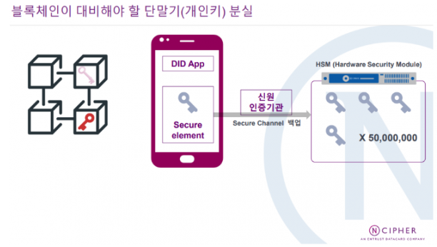 현재는 하드웨어 보안 모듈 (HSM : Hardware Security Module)이 탈중앙화 신원증명(DID)에서 발생할 수 있는 개인키에 대한 분실, 도난등에 대한 유일한 해결책이다.
