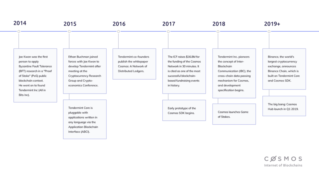 - 2014. 코스모스의 핵심코어인 텐더민트에 대해서 파운더 Jae Kwon이 설계 (텐더민트에 대한 소개는 링크 글 참고 : 코스모스 네트워크 아키텍처에 대한 이해 )