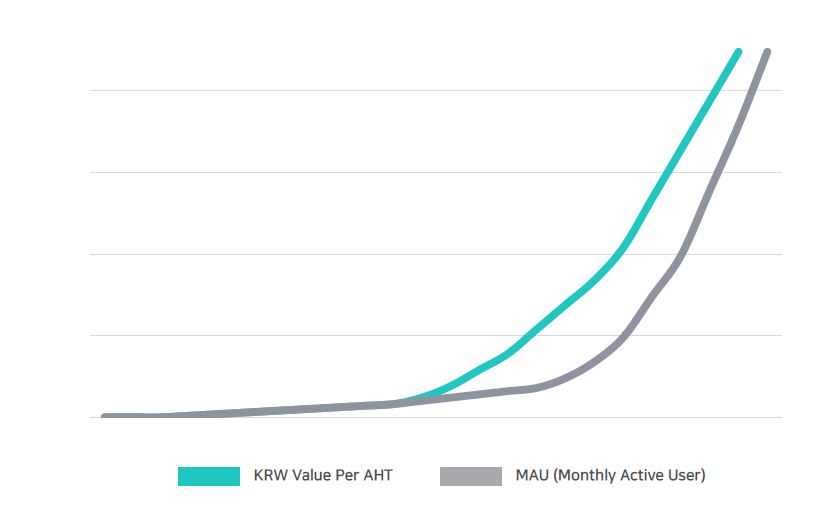 AHT의 가치는 월간 활성 사용자수(MAU)와 정비례 합니다. 즉, 아하서비스가 활성화 되면 활성화될 수록 MAU 수치가 높아질 것이며 이에 따라 AHT 가치는 자연스럽게 동반 상승합니다. 즉, 이는 아하서비스가 네트워크이펙트 (Network Effect)가 발생할 경우 자연스럽게 AHT 가치 상승과 직결됨을 의미합니다.