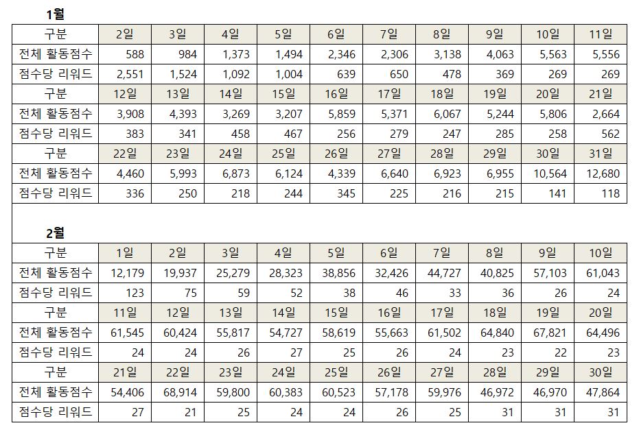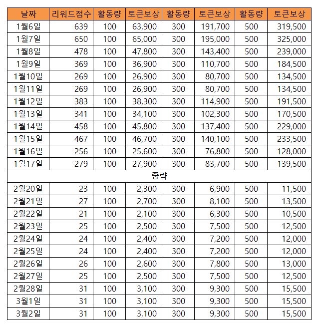 위 그래프 수치를 보면 1월에는 100점의 경우에 60,000토큰에서 20,000토큰으로 줄어들고 300점의 경우 약 200,000토큰에서 80,000토큰으로 줄어들었고 500점의 경우 300,000토큰에서 140,000토큰으로 줄었습니다. 2월의 경우, 100점의 경우 평균 2,500토큰을 받고 있으며 300점의 경우 8,000토큰 500점의 경우 13,000토큰을 받았습니다.