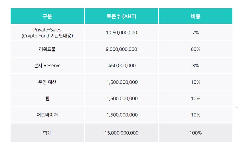 총 발행량은 150억개이며 Public-Sale은 진행하지 않고 Private-Sale만 진행합니다. 기관이나 특정개인투자자들에게만 판매하기 때문에 공개적인 ICO 가격은 알 수 없습니다. 특별히 전체 토큰의 60%인 90억개를 리워드풀로 분배하고 있는점이 AHT만의 특징입니다.