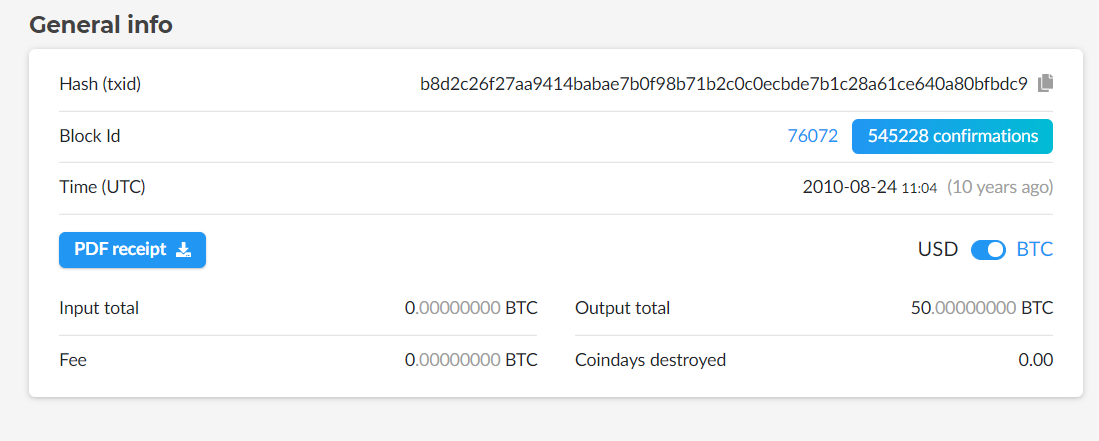 아래는 해당 비트코인 지갑에서 10년전 트랜잭션 내용입니다.