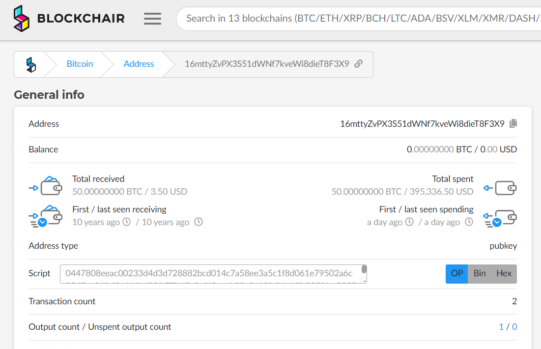 2010년 이후 처음 트랜잭션이 있어서 사토시나카모토의 비트코인 지갑주소로 많은 분들이 추정하고 있습니다.