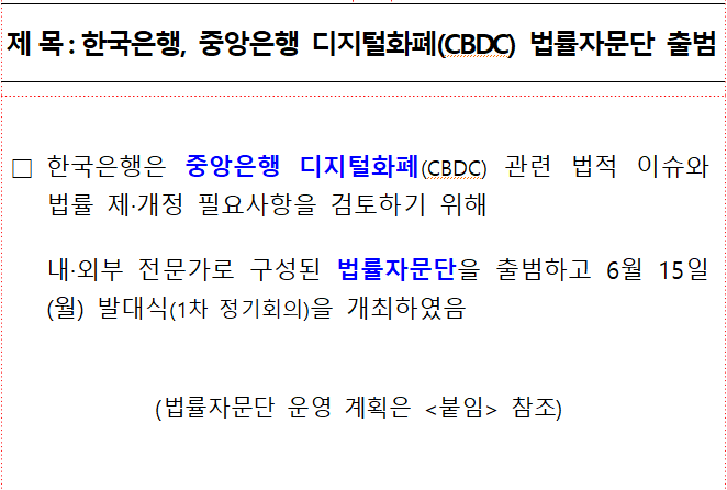 한국은행, 중앙은행 디지털화폐(CBDC) 법률자문단 출범