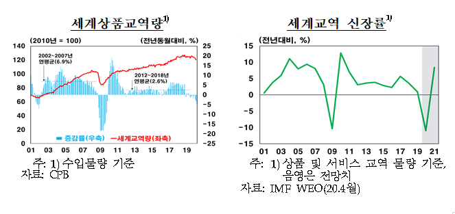 ㅇ서비스교역이 급격히 위축된 가운데 상품교역도 감소세를 보이고 있으나, 향후 글로벌 경기회복과 함께 세계교역도 점진적으로 개선될 전망