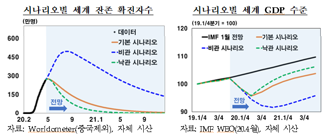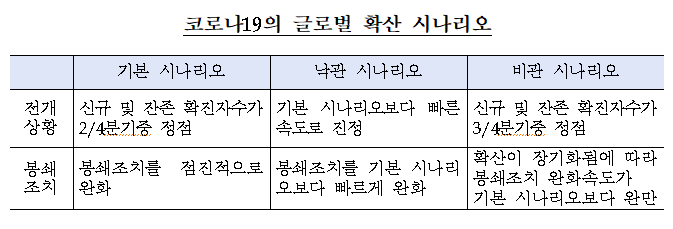 *<참고> ‘감염병 확산 모형을 이용한 세계 및 우리 경제에 대한 시나리오 분석’에서 코로나19 확산 시나리오별 세계경제와 우리경제에 미치는 영향을 분석