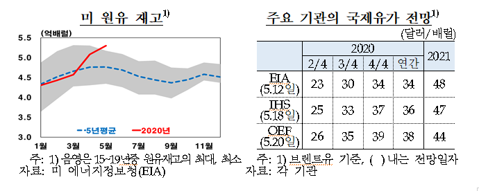ㅇ다만 수요회복 속도가 더딜 것으로 예상되고, 원유재고도 누적되어 있어 국제유가가 당분간 코로나19 확산 이전 수준까지 상승하기는 쉽지 않을 전망
