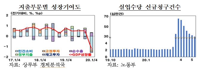 ㅇ1/4분기 성장률이 -3.8%(전기대비)를 기록하였으며 확산억제 조치가 4월까지 강도 높게 시행됨에 따라 2/4분기에는 더욱 큰 폭의 경기 위축이 예상