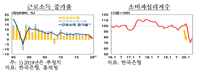 ㅇ고용부진 및 임금상승세 둔화, 자영업자 사업소득 감소 등으로 가계소득 증가세가 크게 둔화되고, 소비심리 위축 및 외부활동 자제에 따른 지출감소로 소비성향도 하락