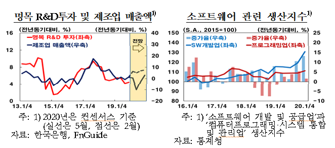 ㅇ정부 R&D투자는 디지털·비대면 혁신기술에 대한 투자 확대 등으로 견실한 증가세를 유지하겠으나, 민간 R&D투자는 기업매출이 감소 전환하면서 증가세가 둔화