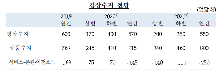 □경상수지 흑자규모는 2020년과 2021년에 각각 570억달러 및 550억달러로 전망