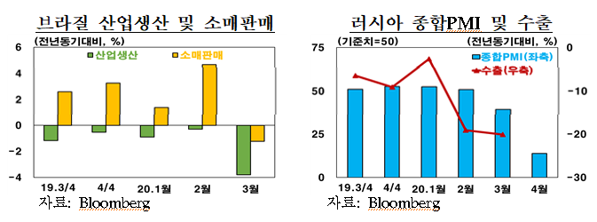 ▪브라질은 소비 및 산업생산이 빠르게 둔화되고 있는 가운데 4월 이후 격리조치 본격 시행에도 불구하고 확진자가 급증하며 경기위축이 심화