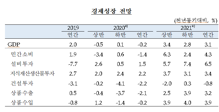 □최근 국내외 여건변화 등을 고려할 때, 경제성장률은 2020년 -0.2%, 2021년 3.1% 수준을 나타낼 전망
