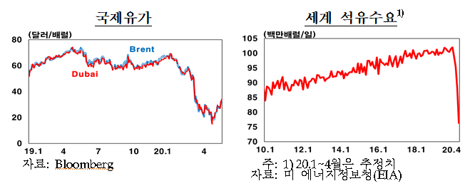ㅇ주요국의 경제활동 부분 재개로 석유수요가 완만하게 회복되고 OPEC+ 감산, 미국 원유생산 감소로 인해 원유공급 과잉도 점차 완화될 것으로 예상