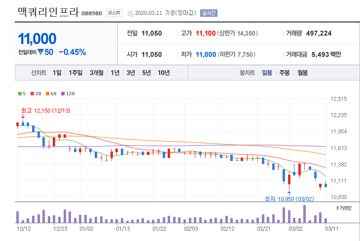 맥쿼리인프라(088980) 일봉차트(2020년3월11일)