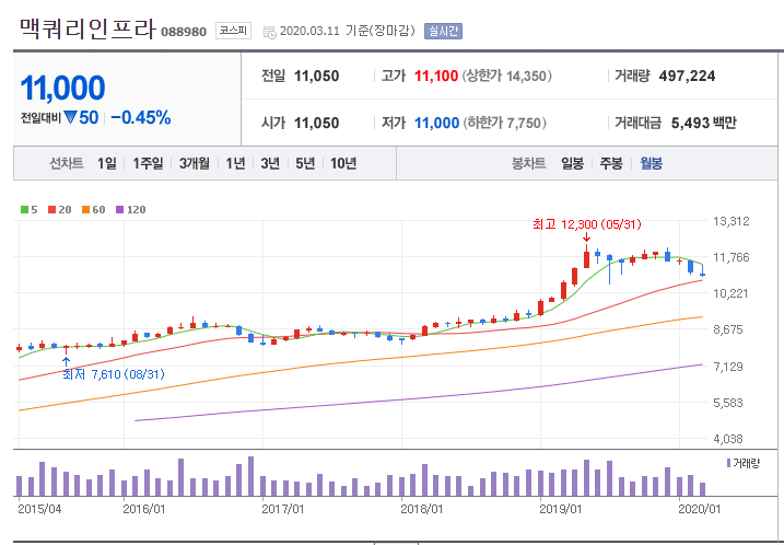 맥쿼리인프라(088980) 월봉차트(2020년3월11일)