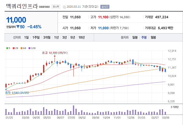 맥쿼리인프라(088980) 주봉차트(2020년3월11일)