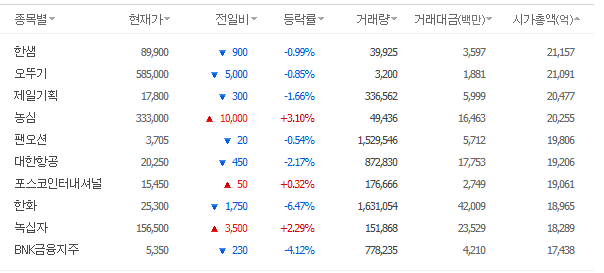 삼성전자(시총 325조), SK하이닉스(시총65조), 삼성바이오로직스(시총50조), NAVER(시총40조), 셀트리온(시총40조), LG화학(시총32조), 삼성SDI(시총27조), 현대카(시총23조), 카카오(시총23조), LG생활건강(시총21조)