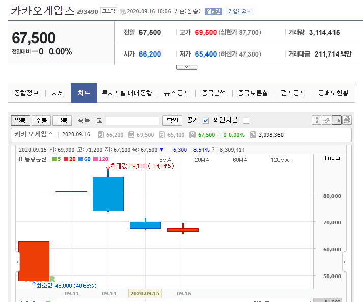 카카오게임즈 상장 시작가는 48,000원이었는데, 89,100원까지 올랐다가 현재(2020년9월16일) 67,500원입니다. 89,100원까지 상장했던 카카오게임즈 주가가 증권플러스 비상장앱에서 얼마에 거래되었는지 한번 살펴볼께요!