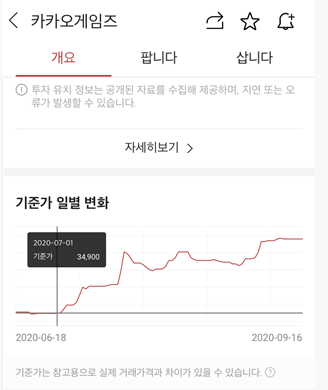 2020년 7월 1일 기준 34,900원에 거래되었습니다. 그 이후로는 60,000원대 마지막 상장전에는 70,000대까지 올라갔어요. (즉 조금 일찍 매수하면 이익이지만, 상장전이라고 해서 무조건 저렴하진 않다는거죠. 시장가를 예측할 수 없기때문에 잘 판단해야 할 필요가 있습니다.) / 무조건 상장전 매수!! 이건 비추천이라는거죠~