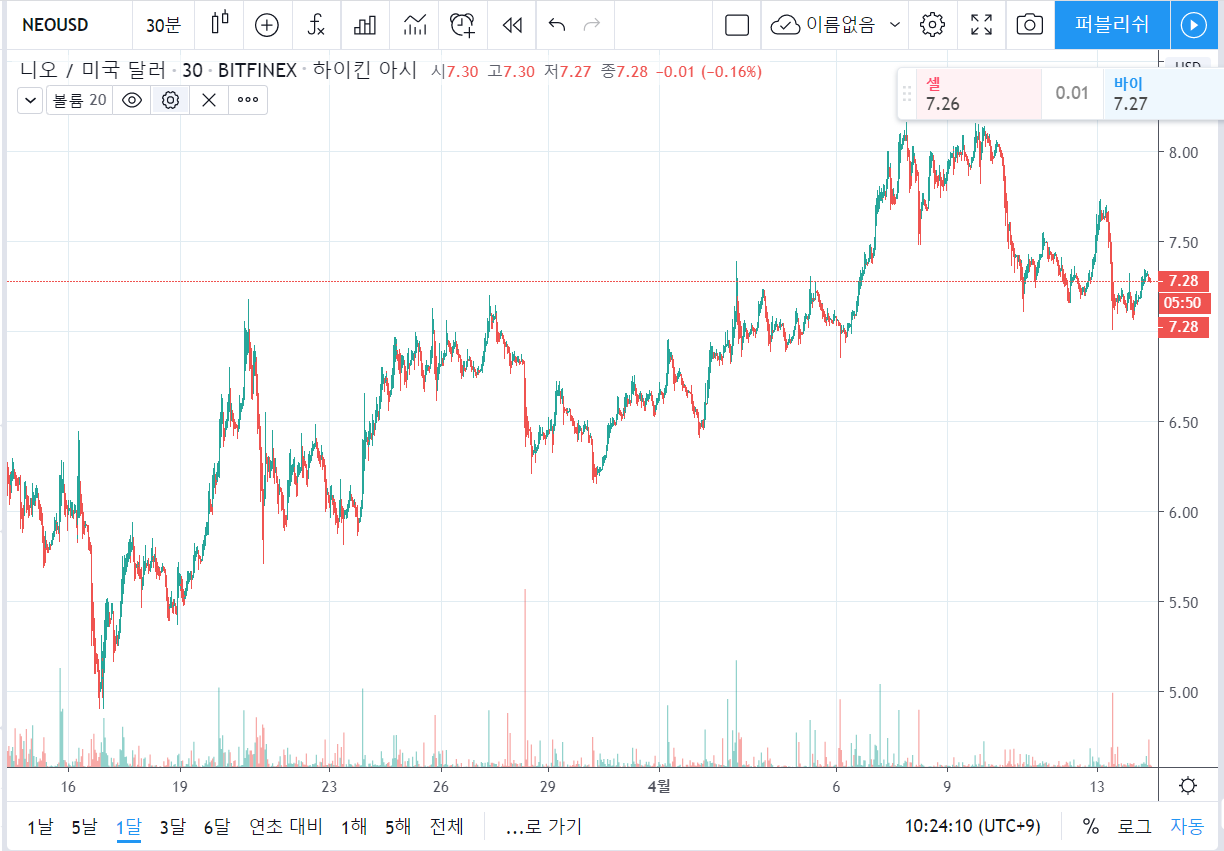 네오 코인 전체 흐름을 보면 최근에는 $7에서 유지하고 있는 모습을 보여주고 있다.