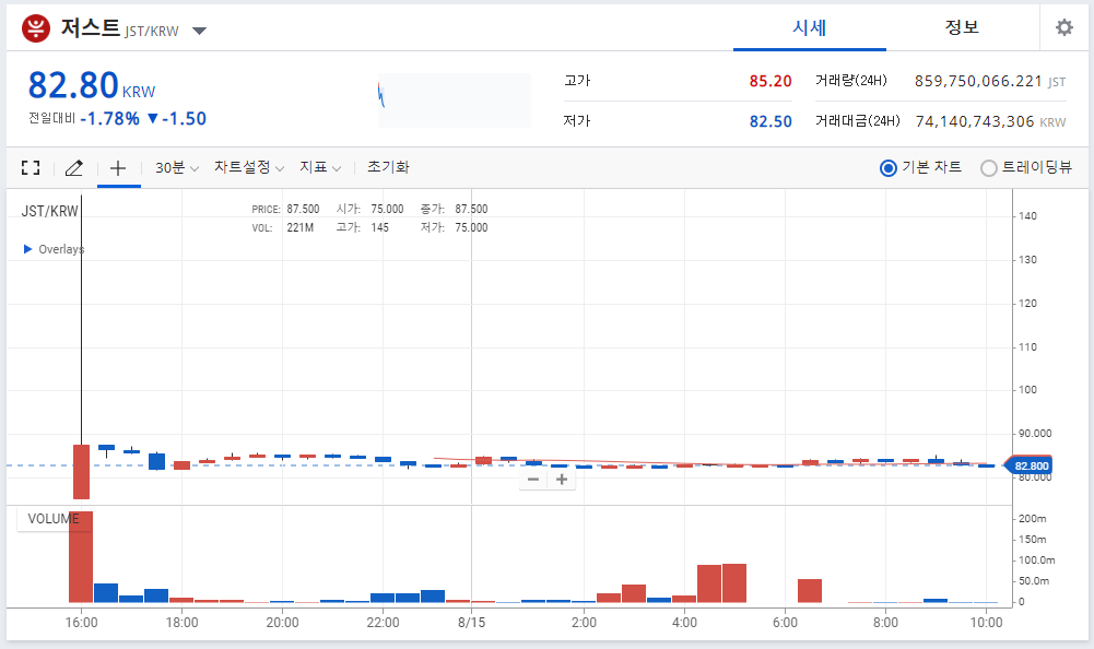 8월 15일 오전 10시 기준 82.8원에 거래되고 있으며 24시간 거래량은 741억원입니다.