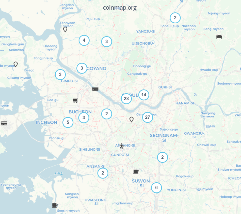 코인맵에 보시면 아래와 같이 해당지역에 비트코인으로 결제가 가능한 상점들의 정보가 나옵니다.