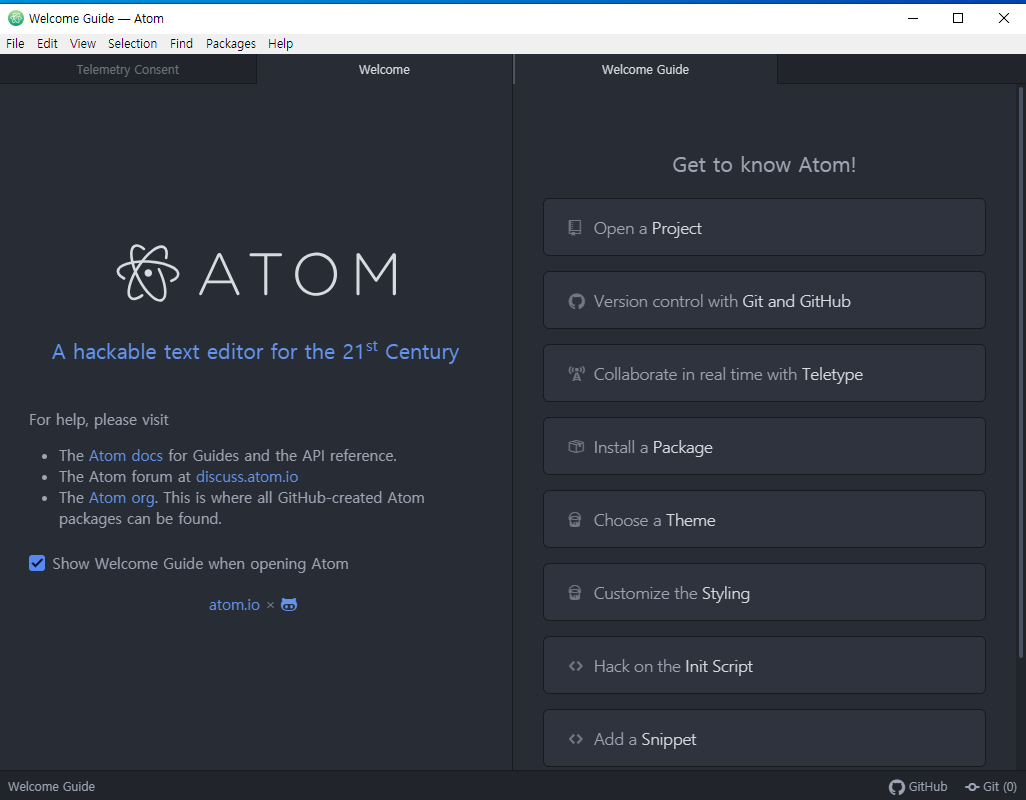 그리고 시간이 조금 지나면, 이렇게 ATOM 에디터가 실행이 됩니다.