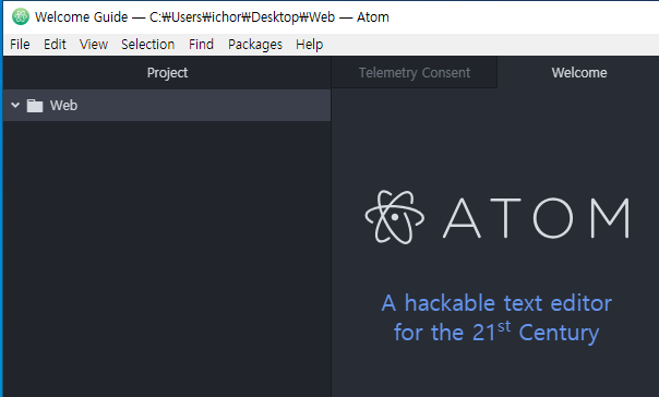 그리고 시간이 조금 지나면, 이렇게 ATOM 에디터가 실행이 됩니다.