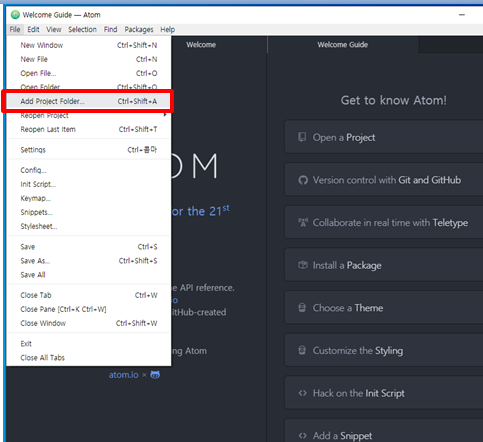 5. ATOM 에디터에서 프로젝트폴더로 추가(메뉴-파일-Add Project Folder)