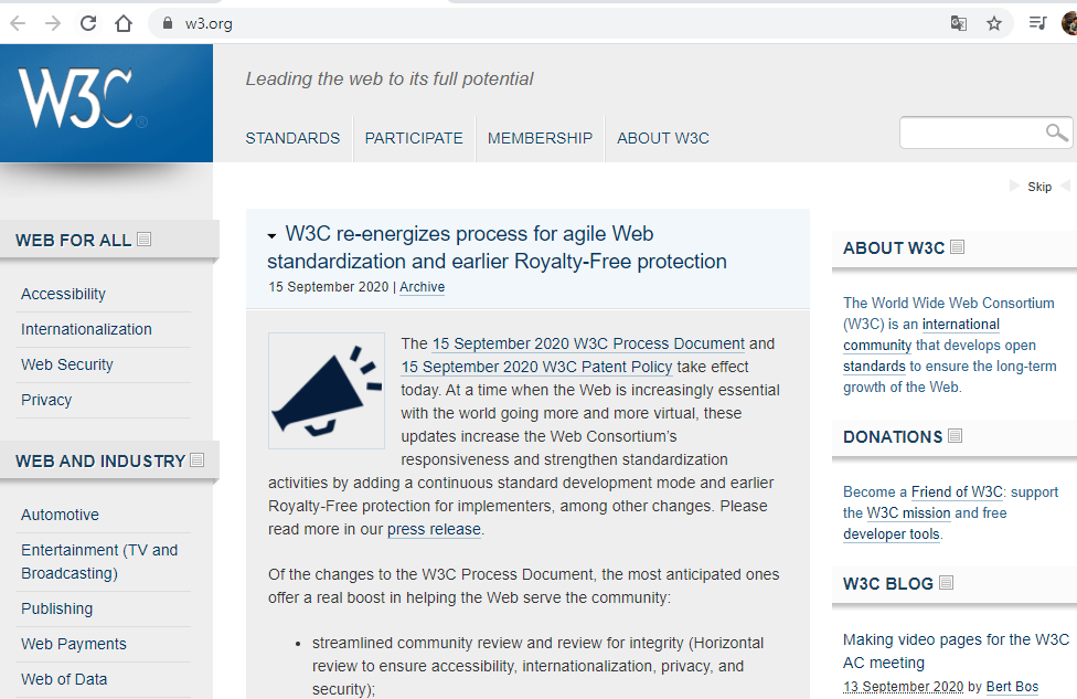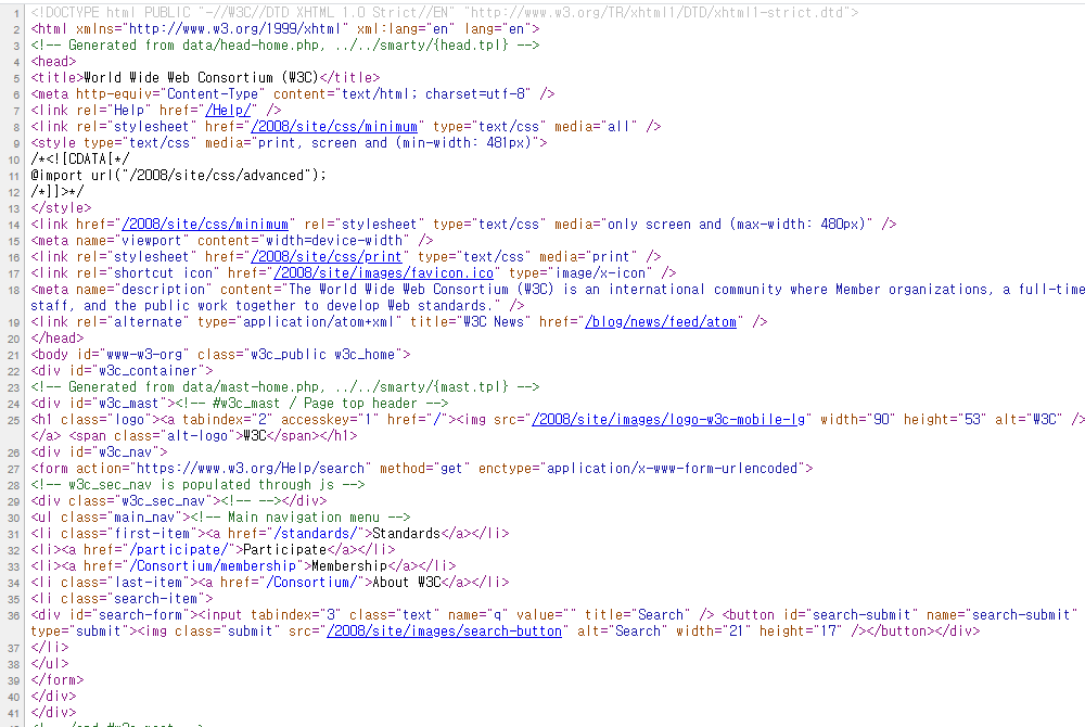 W3C(The World Wide Web Consortium)라는 국제민간표준화기구의 홈페이지입니다.