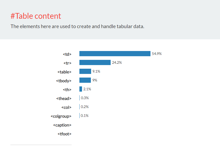 구글에서 전세계 웹페이지를 분석한 결과에 대한 홈페이지가 있습니다. 여기에 어떤 태그가 많이 사용되었는지 나오는데요. 이중에서 빈도수만 높은것만 알아도 이후에 자바스크립트, Node.js, 솔리디티를 배우는데 큰 어려움은 없습니다.