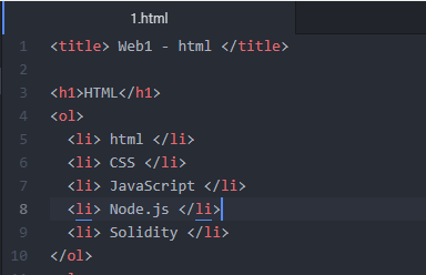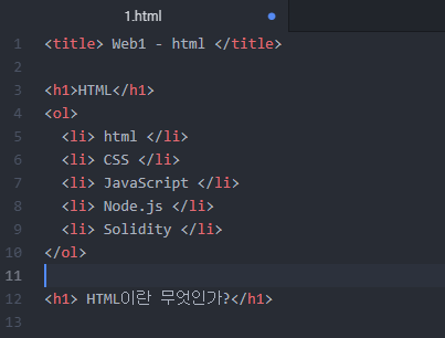아래와 같이 <title> </title> 안에 Web1 - Html로 작성해봅니다.
