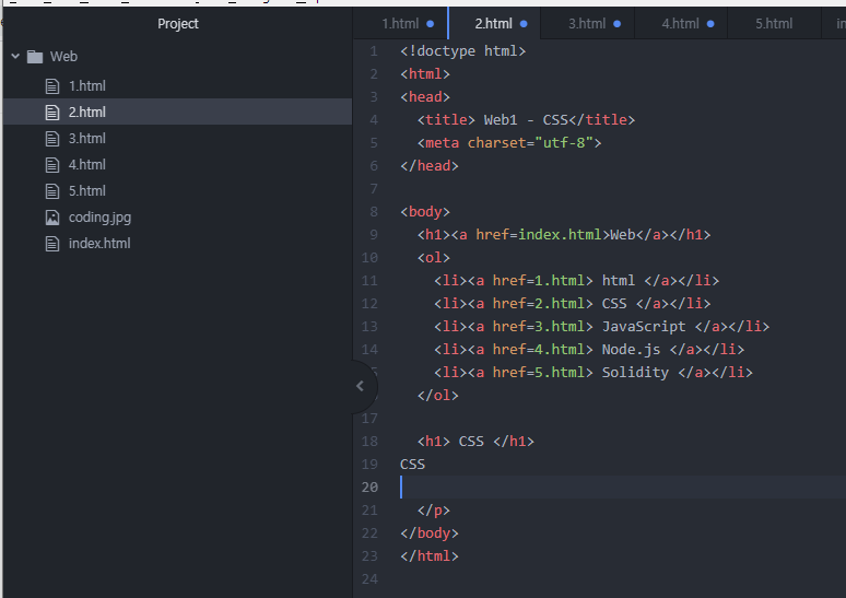 각 항목마다 1.html, 2. CSS 3. Javascript, 4. Node.js 5. Solidity 를 클릭하면 연결되도록 해볼께요!!!
