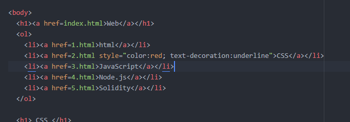 <li><a href=2.html style="color:red; text-decoration:underline">CSS</a></li>