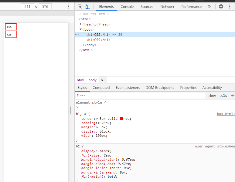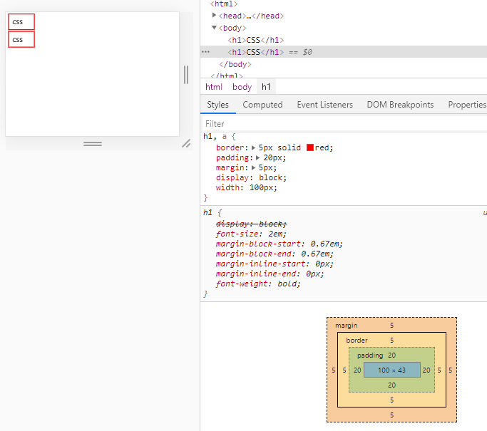 이걸 선택하면 아래에 h1에 대한 boder, padding등의 속성값을 확인할 수 있어요~