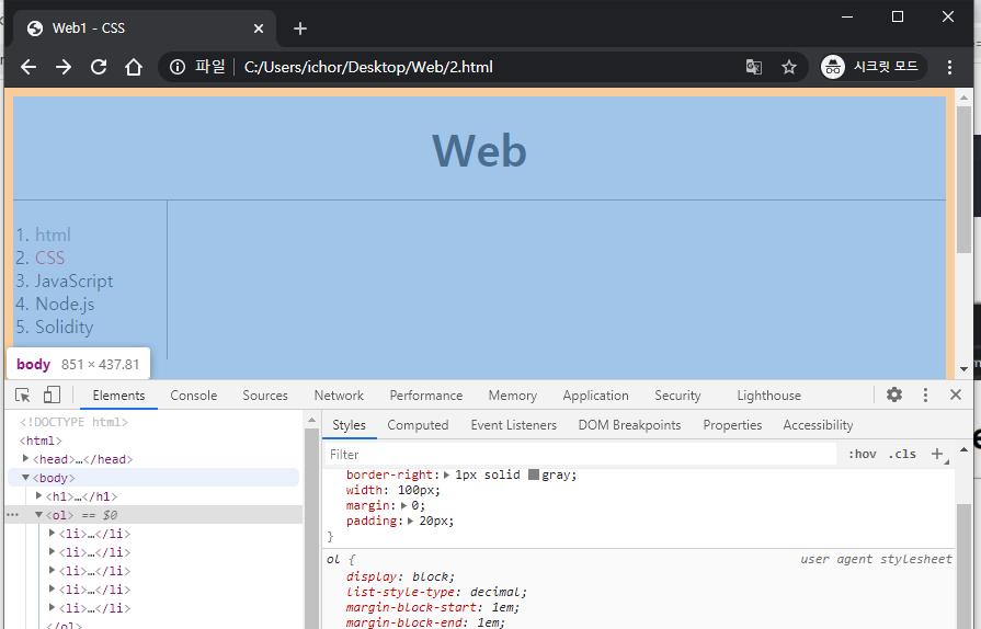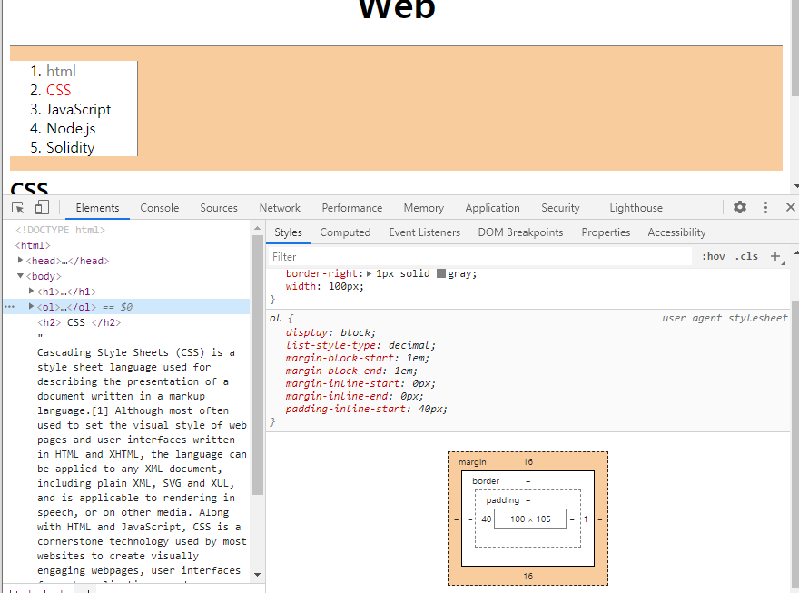 <body>의 <ol>태그를 마우스로 클릭하고, 오른쪽에 margin에 마우스를 올려보니, margin값이 너무 많군요.