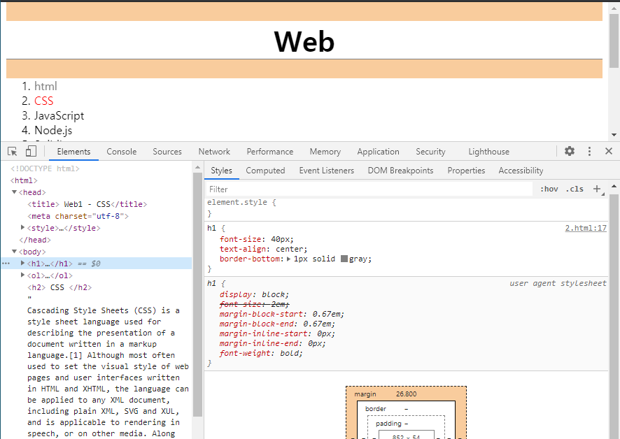 Web이 h1태그에 있으니 이 h1태그속성에 boder-bottom:1px solid gray을 줍니다.