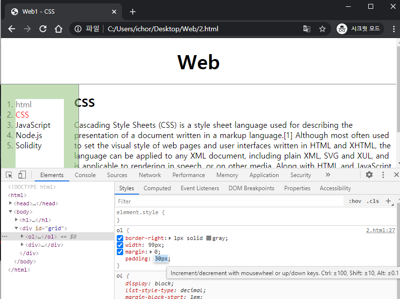 ol태그에서 아래 padding:20px에 마우스를 올려보시면 값수정이 가능합니다. 이걸로 적당한 값을 찾아냅니다.