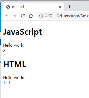 네, 아래와 같이 자바스크립트는 1+1을 연산했고 HTML은 그냥 문자 그대로 출력만 했네요!