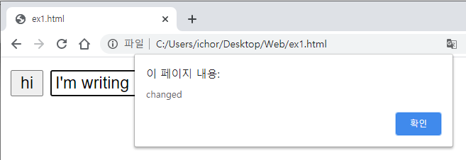 텍스트 입력창에 변화가 생겼다는 이벤트를 발생시켰기때문에 이렇게 알람 메세지가 뜨는거죠~