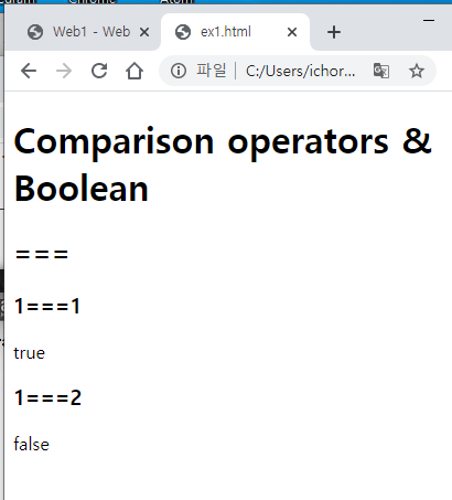 '==='와 동일하게 비교연산자 '<,>'의 결과로 boolean인 true, false를 알려주는걸 배우게되었습니다.
