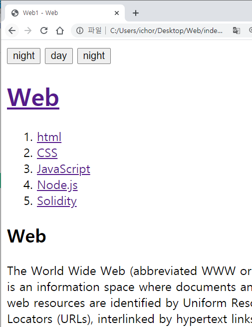 기존에 night, day를 번갈아가면서 클릭하는게 뭔가 부족함을 느껴져서 아래와 같이 오른쪽에 버튼을 하나 더 만들어서 night이면 day로 표시되고, day이면 night으로 표시되어 버튼 하나만 눌러서 낮,밤이 바뀌게 하는걸 만들어보려고 합니다.