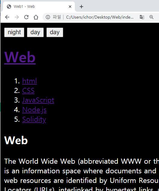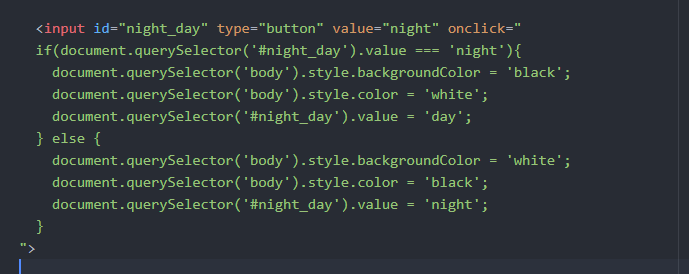 기존에 night, day를 번갈아가면서 클릭하는게 뭔가 부족함을 느껴져서 아래와 같이 오른쪽에 버튼을 하나 더 만들어서 night이면 day로 표시되고, day이면 night으로 표시되어 버튼 하나만 눌러서 낮,밤이 바뀌게 하는걸 만들어보려고 합니다.
