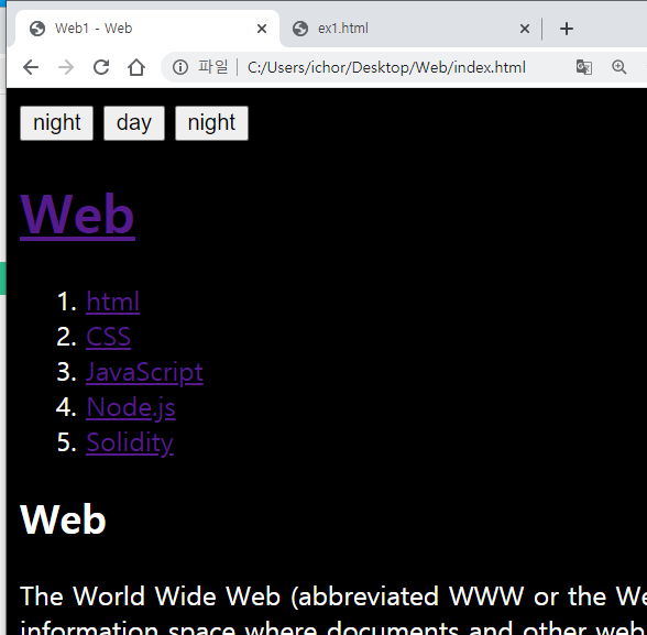 자, 실행을 했더니 night로는 바뀌었는데 이 버튼에서 day로 바뀌진 않는군요!!