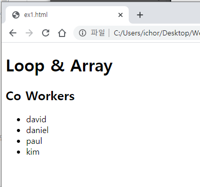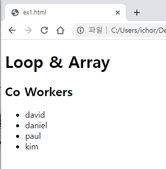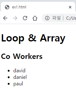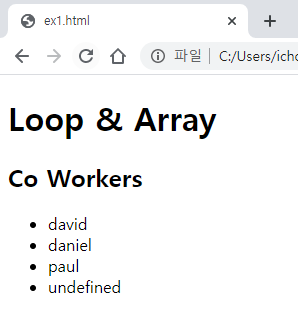 스크립트 안에 <li></li> 사이에 +coworkers[i] +를 추가해줍니다.