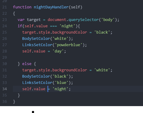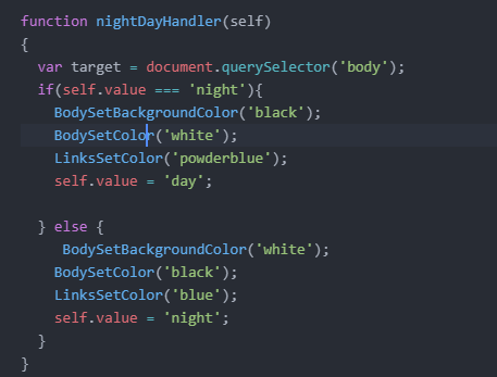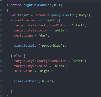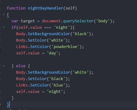 그리고 nightDayHandler에 LinksSetColor('powderblue'), LinksSetColor('blue')요렇게 바꾸었어요.