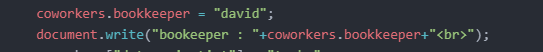 document.write("bookeeper : "+coworkers.bookkeeper+"<br>");