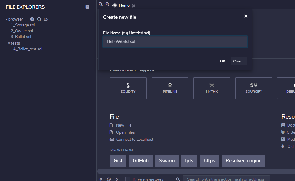 2. 파일명을 HelloWorld.sol로 지정하고 새로운 계약을 생성합니다.